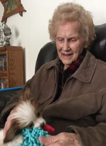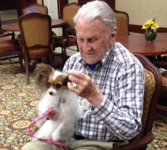 We took her to some classes to learn some basic commands such as sit, down, stay ,heel (she was the hit of the class). She loves to play ball and if we don't throw it she will get the ball run upstairs and let it roll down and then she runs down after it. Loves, loves to play. We starting taking her to the senior living facility a couple of months ago and each time she goes she does better. The residents just love her, especially her ears. Most of them have never seen a papillon before. She is a very smart and active dog that we love. Hope all is well with you and yours. The picture is one of the residents holding Callie.